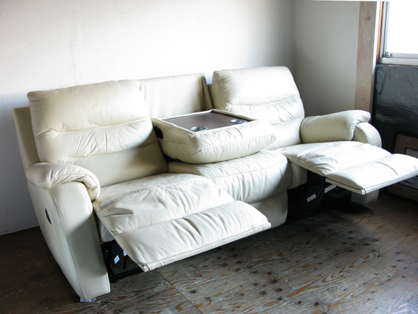 センター部分の背もたれを倒すと、画像で確認出来るようにジュースホルダーの付いたテーブルになり映画鑑賞などに最適なソファだと思います。